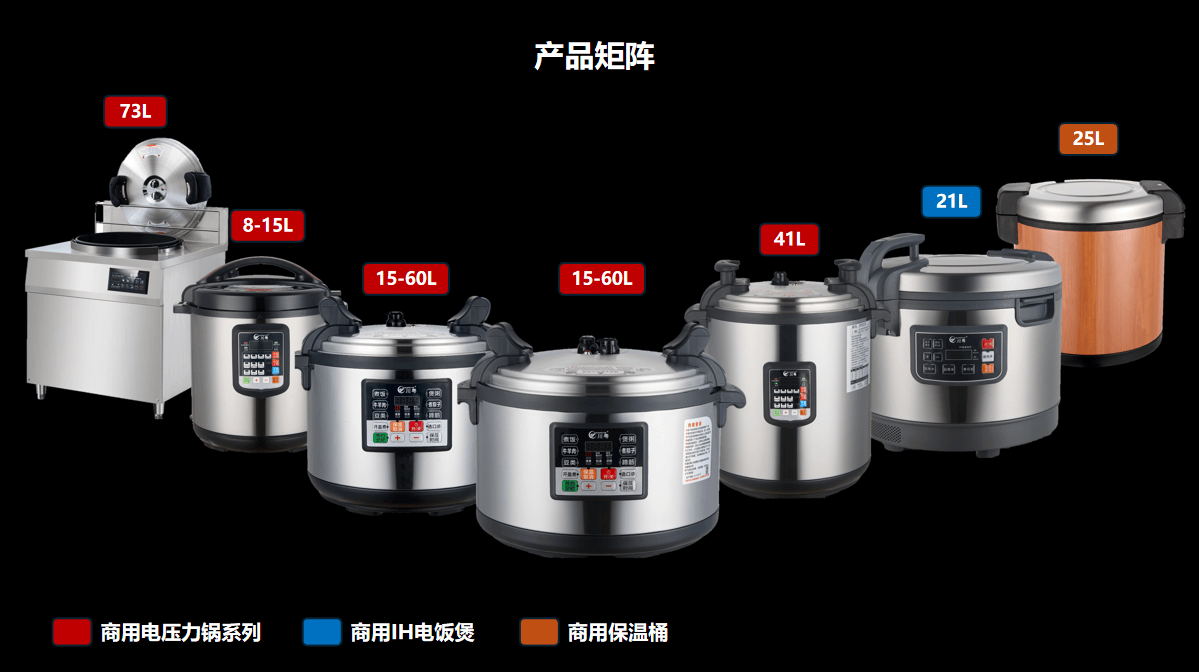 商用IH电饭煲系列:采用3500W大功率设想,连系微压精煮手艺,较着提拔米饭烹调效率和质量,满脚商用厨房的批量出餐需求。