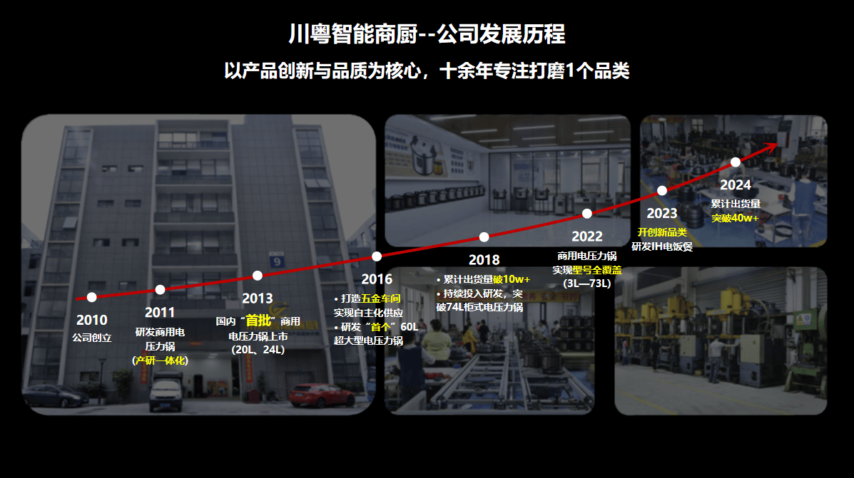 川粤智能商厨(品牌简称:CHUANYUE)成立于2001年,总部位于广东顺德万洋众创园,是一家专注商用厨房设备研发、出产取办事的分析型处理方案供给商。颠末25年的持续成长,公司已成长为笼盖全国并积极拓展国际市场的商厨行业主要企业。回溯商用电压力锅行业的成长脉络,上世纪90年代末至21世纪初,行业尚处于初步摸索阶段,产物手艺不成熟、平安现患凸起、市场认知度低。正在此布景下,川粤公司灵敏捕获到商用烹调场景对高效、平安、节能厨具的火急需求,决然投身商用电压力锅的研发取出产,成为国内第二个涉脚该范畴的企业,了深耕商厨设备的征程。